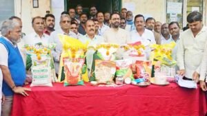 ಹುಕ್ಕೇರಿ ಕೃಷಿ ಇಲಾಖೆ ಆವರಣದಲ್ಲಿ ಜರುಗಿದಚಸರಳ ಸಮಾರಂಭದಲ್ಲಿ ಶಾಸಕ ನಿಖಿಲ್ ಕತ್ತಿ ಬೀಜಗಳಿಗೆ ಪೂಜೆ ಸಲ್ಲಿಸಿ ರೈತರಿಗೆ ಸೋಯಾಬೀನ, ಗೋವಿನ ಜೋಳ ಮತ್ತು ಹೆಸರು ಕಾಳುಗಳನ್ನು ವಿತರಣೆ ಮಾಡಿದರು.